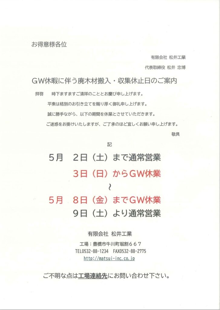 GW休暇に伴う廃木材搬入・収集休止日のご案内